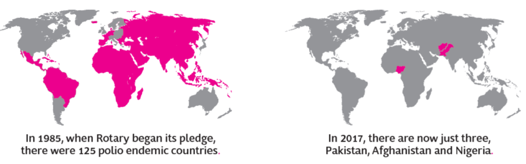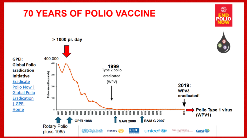 Rotary har siden 1985 jobbet sammen med WHO, UNICEF og U.S. Centers for Disease Control and Prevention (CDC) for en poliofri verden og har vaksinert over 3 milliarder barn mot poliomyelitt.