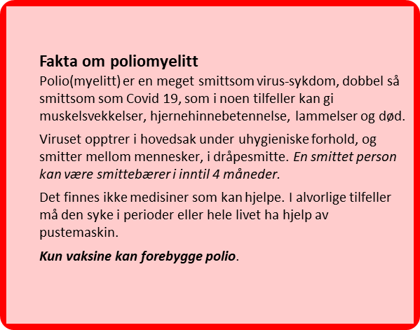 «Fare for internasjonal spredning gjør fortsatt polio til en potensiell internasjonal folkehelsekrise», sier Verdens helse-organisasjon (WHO), som har som mål å utrydde polio innen 2027.